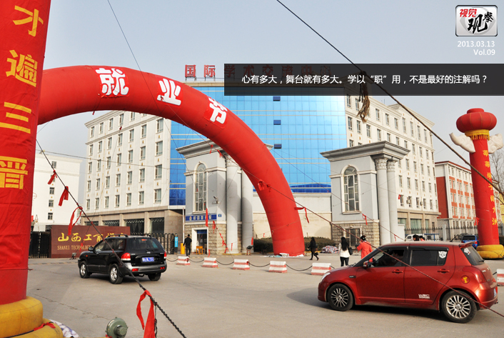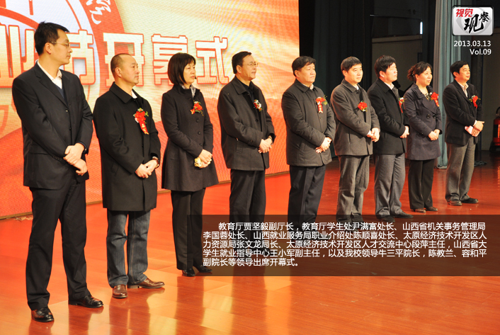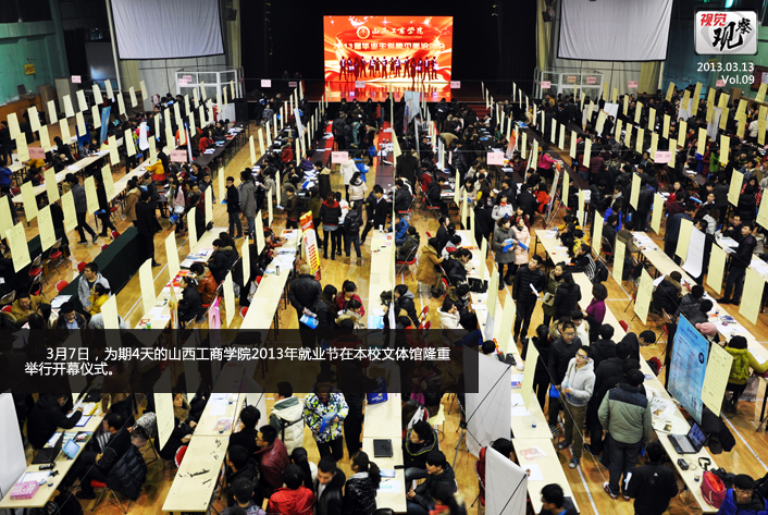 上一图集:先声夺人 下一图集:1月06日至3月14日要闻回顾浏览次数:2683次 发布时间:2013/3/14 3月7日,为期4天的山西工商学院2013年就业节在本校文体馆隆重举行开幕仪式。教育厅贾坚毅副厅长,教育厅学生处尹满富处长、山西省机关事务管理局李国蓉处长、山西就业服务局职业介绍处陈顺喜处长、太原经济技术开发区人力资源局张文龙局长、太原经济技术开发区人才交流中心段萍主任,山西省大学生就业指导中心王小军副主任,以及我校领导牛三平院长,陈教兰、容和平副院长等领导出席开幕式。参加开幕式的还有山西焦煤集团等200余家企业代表和该校2300余名应届毕业生。