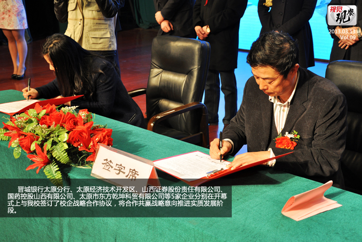 晋城银行太原分行、太原经济技术开发区、山西证券股份责任有限公司、国药控股山西有限公司、太原市东方乾坤科贸有限公司等5家企业分别在开幕式上与我校签订了校企战略合作协议,将合作共赢战略意向推进实质发展阶段。