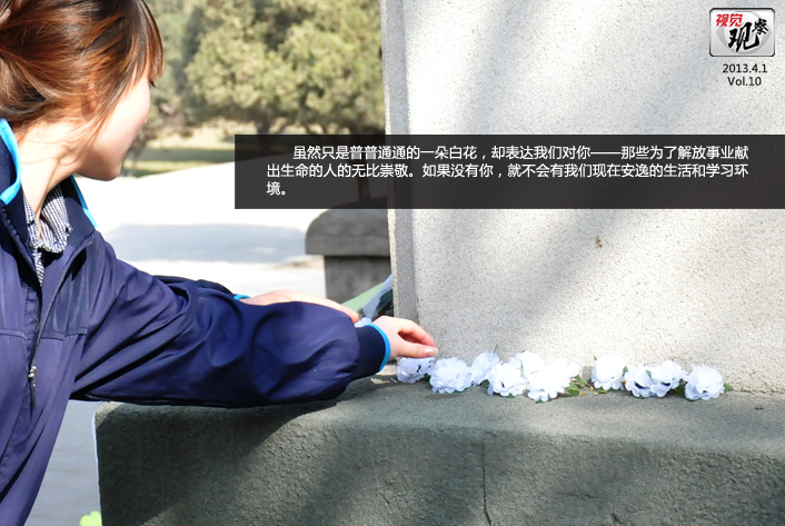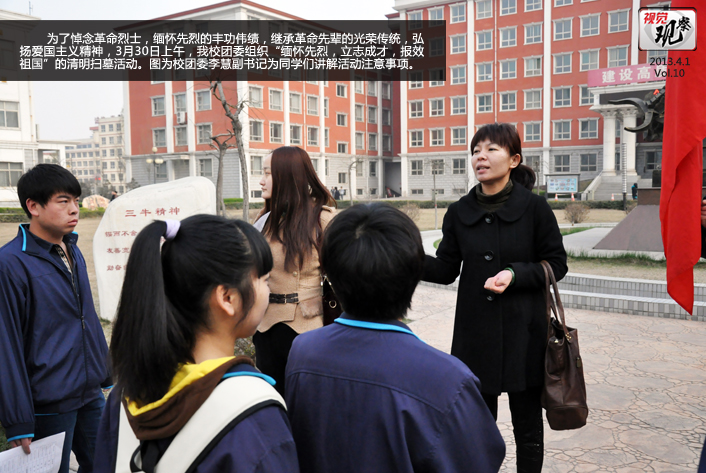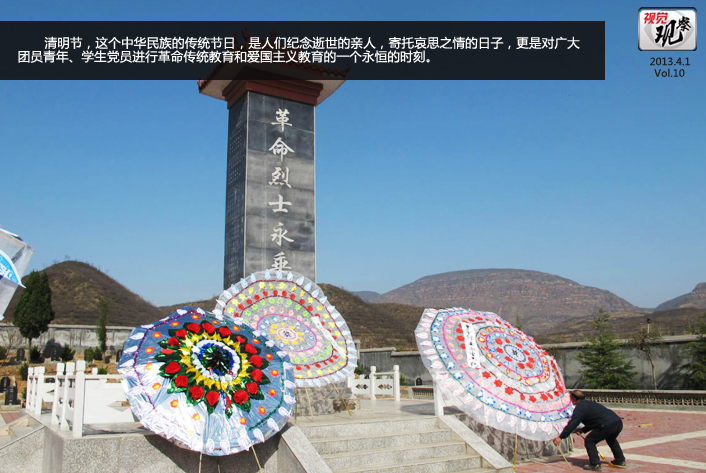 上一图集:1月06日至3月14日要闻回顾 下一图集:起跑的地方浏览次数:4964次 发布时间:2013/4/1 清明节,这个中华民族的传统节日,是人们纪念逝世的亲人,寄托哀思之情的日子,更是对广大团员青年、学生党员进行革命传统教育和爱国主义教育的一个永恒的时刻。