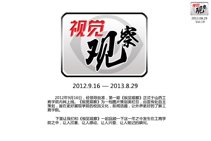 2012年9月16日,经领导批准,第一期《视觉观察》正式于山西工商学院内网上线。《视觉观察》为一档图片策划类栏目,由宣传处自主策划,旨在更好展现学院的校园文化,新闻话题,让外界更好的了解工商学院。