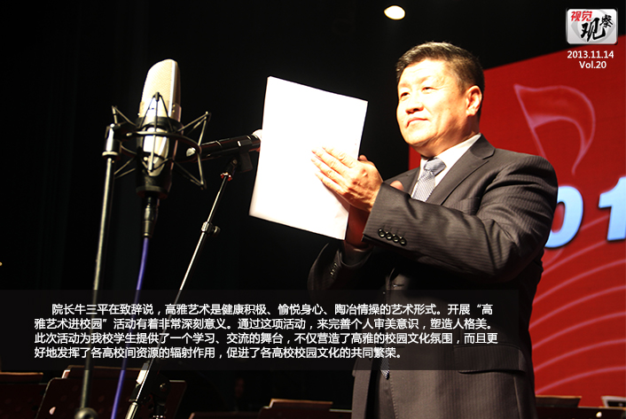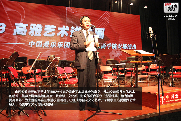 感受大师风范,触摸高雅经典;台上演得起劲,台下观众陶醉。11月12日,中国爱乐乐团来我校举行专场音乐会。作为教育部、文化部、财政部三部委“高雅艺术进校园”活动的一部分,中国爱乐乐团为我校师生带来了一场高雅的艺术享受。