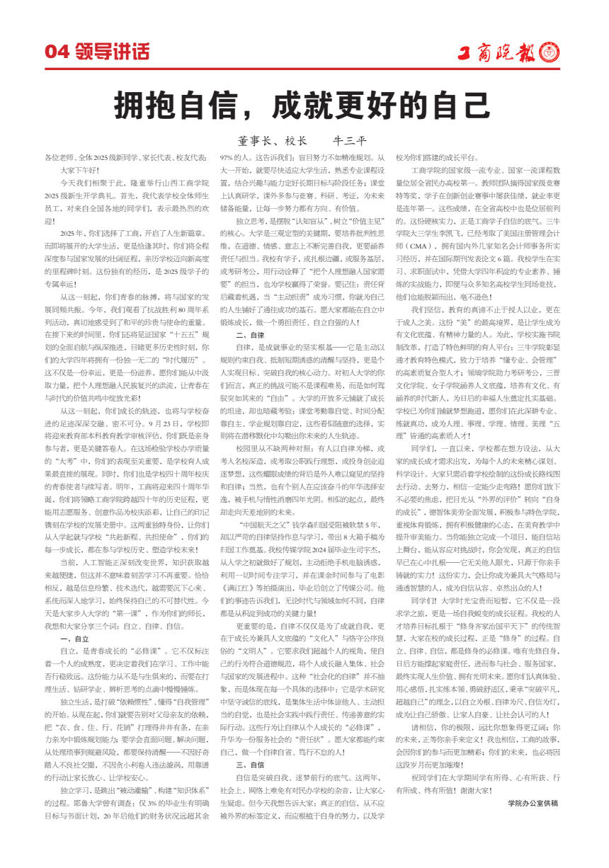 大学时光宝贵而短暂,它不仅是一段求学之旅,更是一场自我蜕变的成长征程。我校的人才培养目标扎根于“修身齐家治国平天下”的传统智慧,大家在校的成长过程,正是“修身”的过程。自立、自律、自信,都是修身的必修课。唯有先修自身,日后方能撑起家庭责任,进而参与社会、服务国家,最终实现人生价值、拥有光明未来。愿你们认真体验、用心感悟,扎实练本领、勇破舒适区,秉承“突破平凡,超越自己”的理念,以自立为根、自律为尺、自信为灯,成为让自己骄傲、让家人自豪、让社会认可的人!